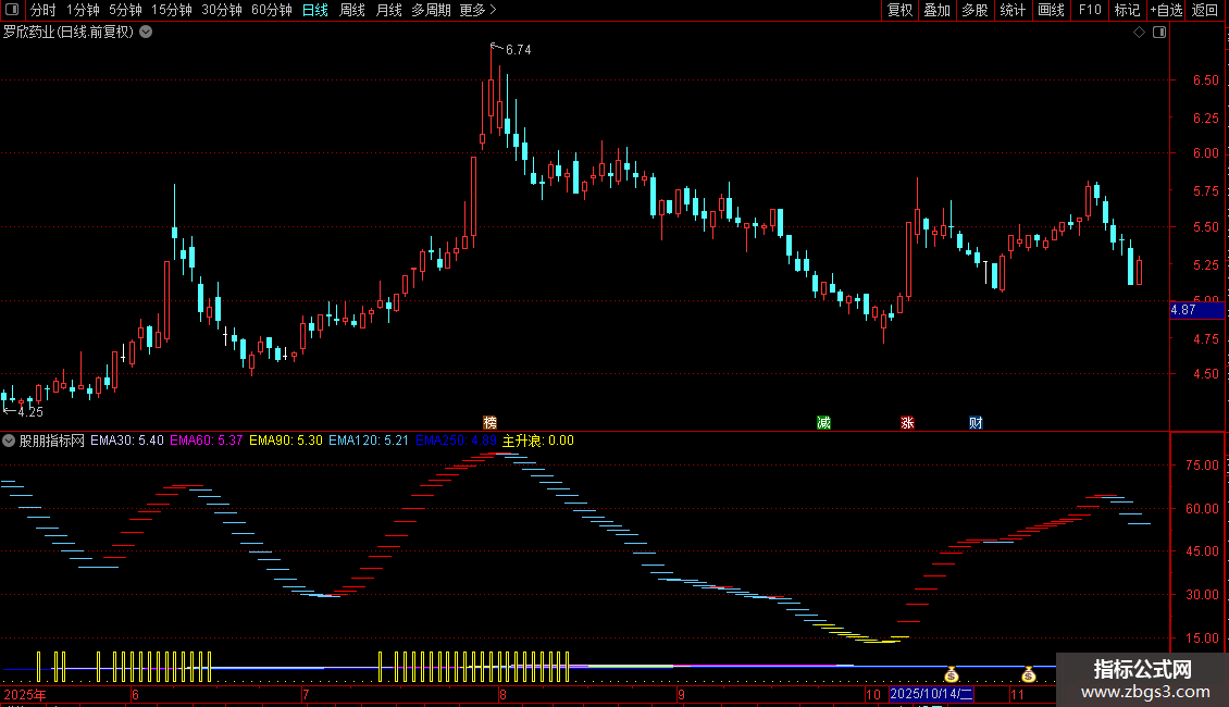 主升浪:IF(WINNER(C*0.9)*100-V/CAPITAL*100>=25,10,0),COLORYELLOW,POINTDOT;
