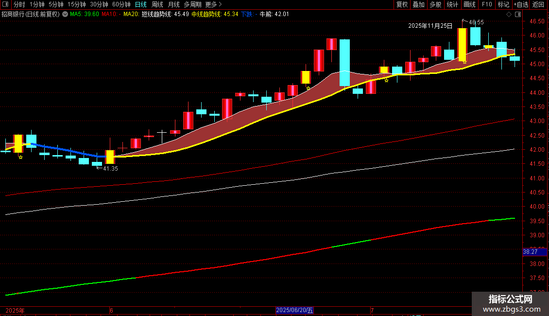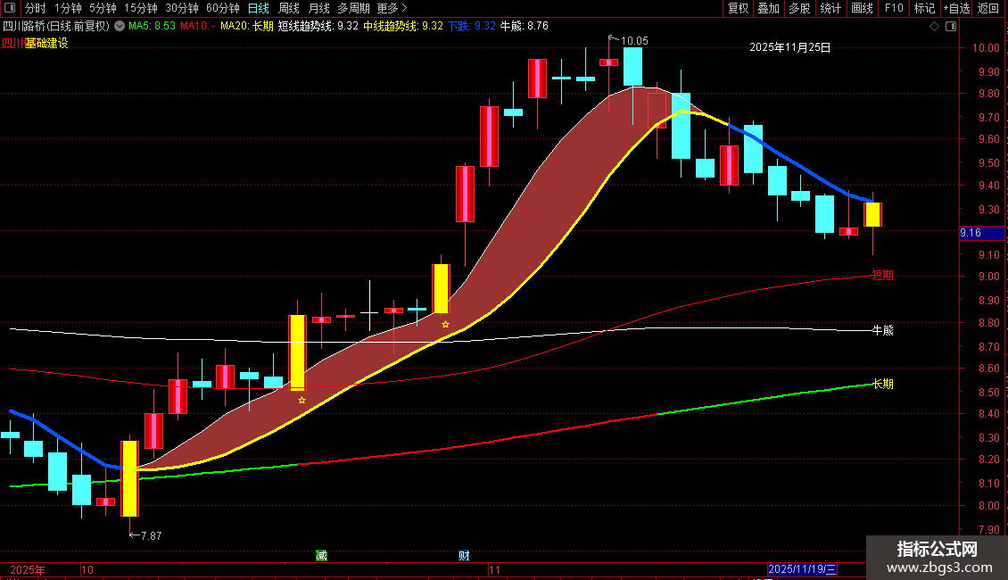 指标通过计算多周期加权均价形成短期和中期趋势线,结合乖离率和动量指标识别买卖点。当短期趋势线上穿中期趋势线且动量指标转强时买入,下穿时卖出;同时参考长期趋势线和牛熊分界线判断大方向。