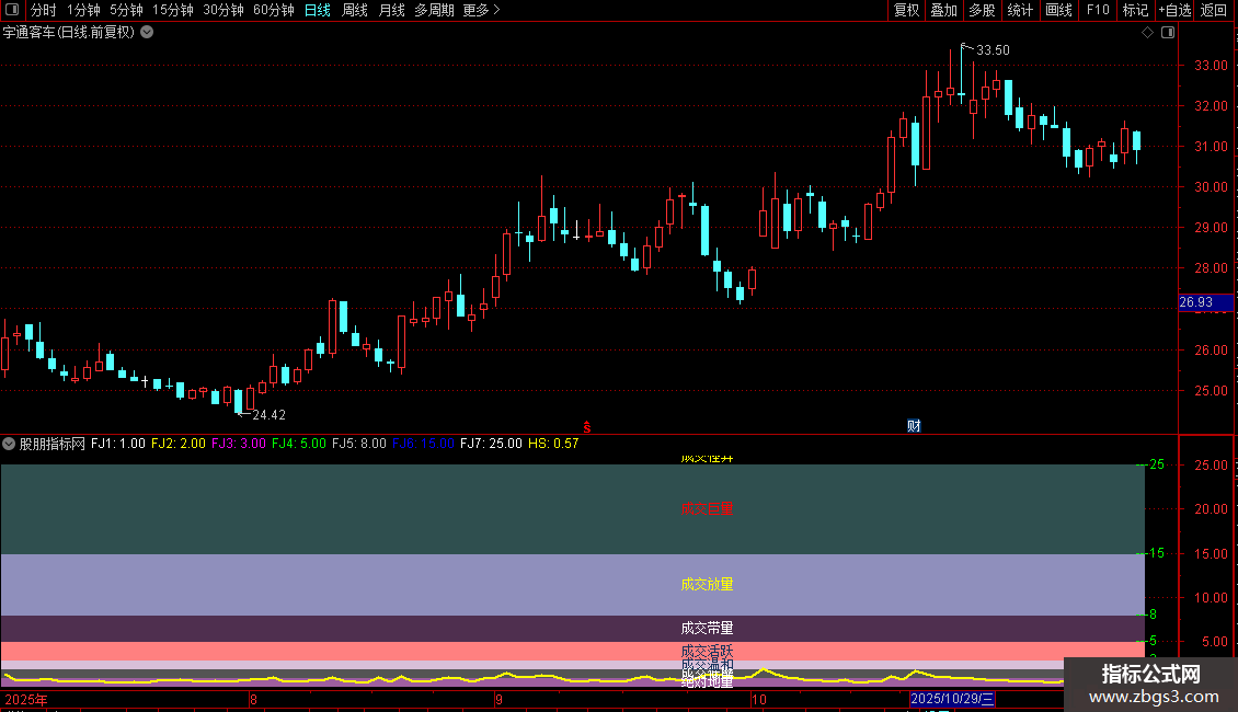 DRAWTEXT(HS<FJ7 AND HS>=FJ6 AND ISLASTBAR,HS,'-----巨量'),COLORGREEN;