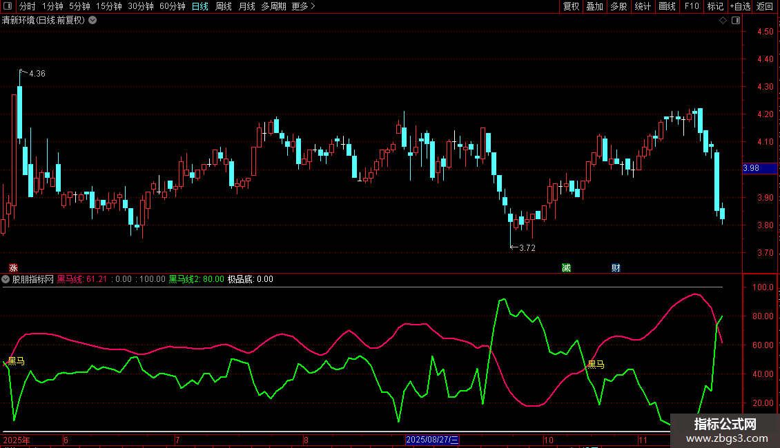 黑马线:EMA(VAR11,5), LINETHICK2,COLOR6600FF;