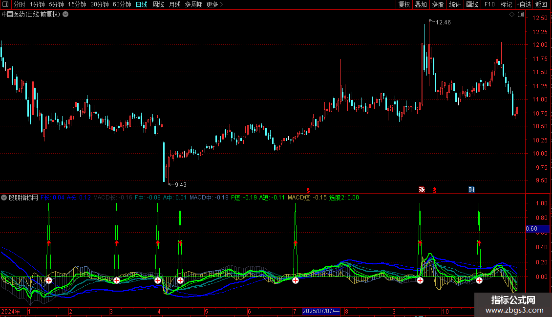 A中:EMA(F中,9),COLORLICYAN,LINETHICK1;