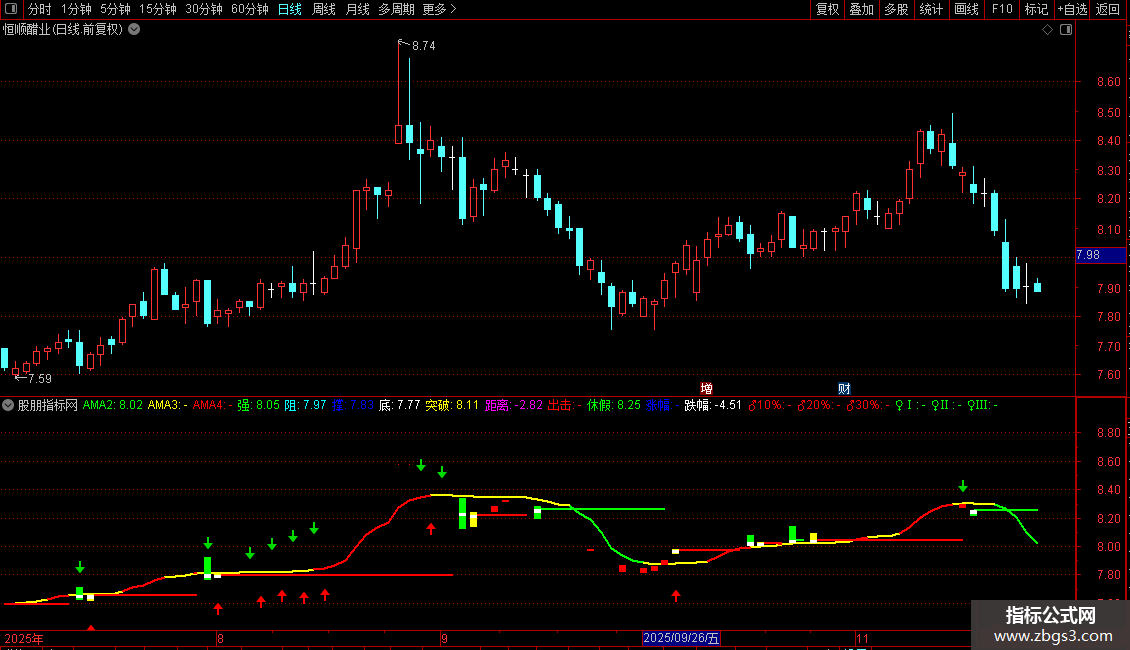 AMA2:EMA(DMA(CLOSE,CQ2),2),COLORGREEN,LINETHICK2;
