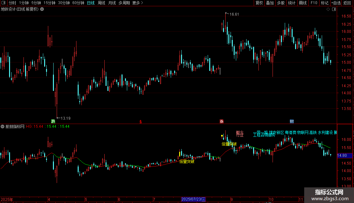指标通过识别历史高点位置,结合成交量异动和价格突破行为,在K线图上标记买入信号点,并显示行业概念信息辅助决策。