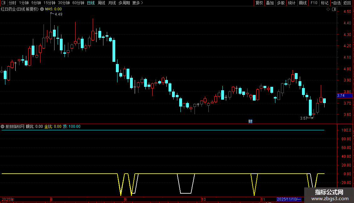 金银坑指标公式包含公式 金坑负50 银坑负45 本指标能选出带坑个股 需要手动过滤破位下跌股票 保留底部盘整多日后开始向上的品种 操作应在坑的右侧逐步建仓