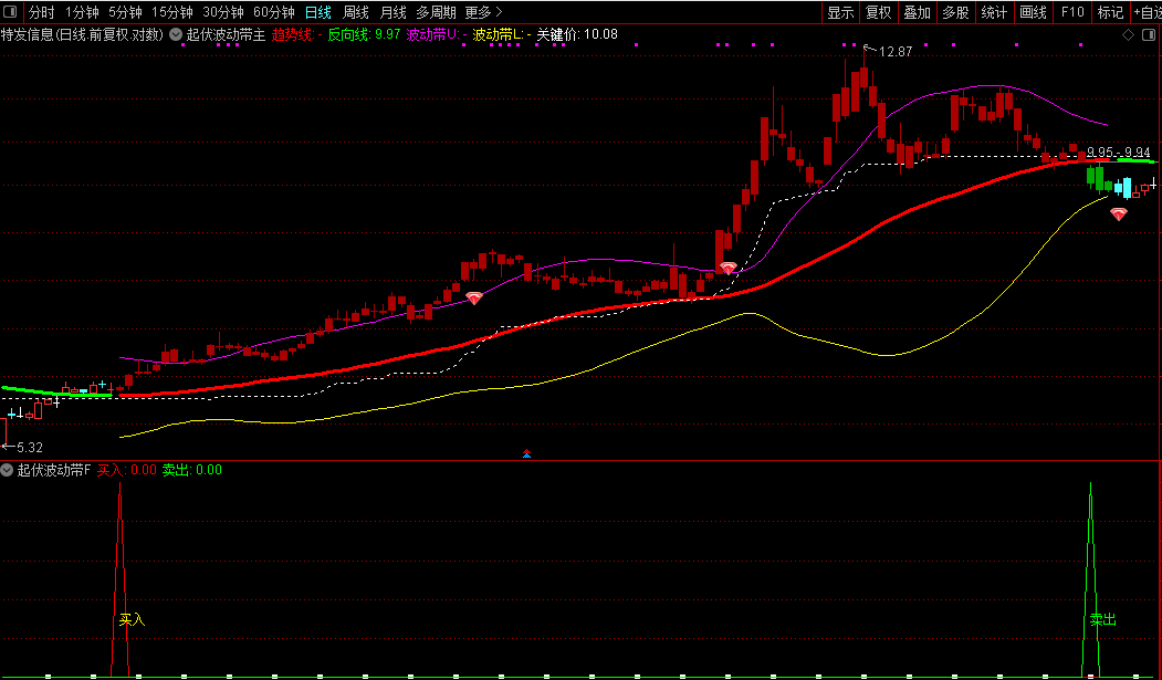 用法很简单:当K线在趋势线上方运行时,显示为蓝色,说明走势较强;在下方则显示绿色,表示相对弱势。更实用的是,当股价突破上轨时会显示卖出信号,跌破下轨则出现买入提示,帮你捕捉关键交易时机。同时还有一条白色关键价线,辅助你判断中长期支撑压力位。