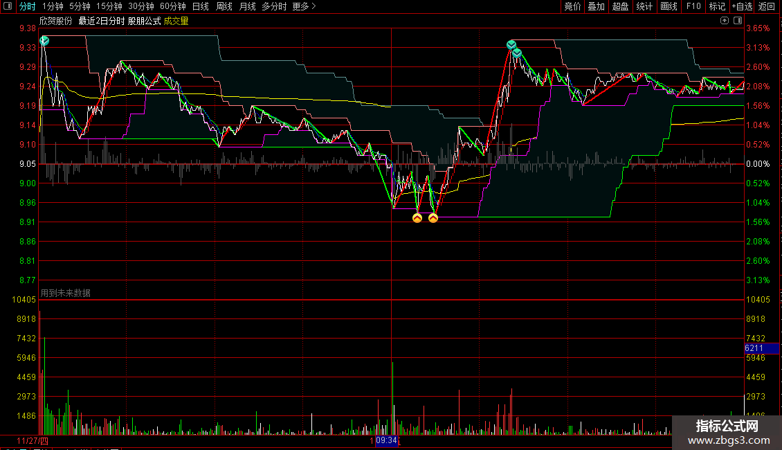 该指标的核心在于 分笔线段的划分 。通过特定的算法,指标将分时图中的价格走势划分为一个个清晰的线段,每个线段代表着一段趋势的运行。在此基础上,指标进一步识别出 盘整区间 、 趋势反转 等关键信息,并通过 颜色、箭头、文字提示 等多种形式直观地呈现在分时图上,方便一目了然地把握时机。
