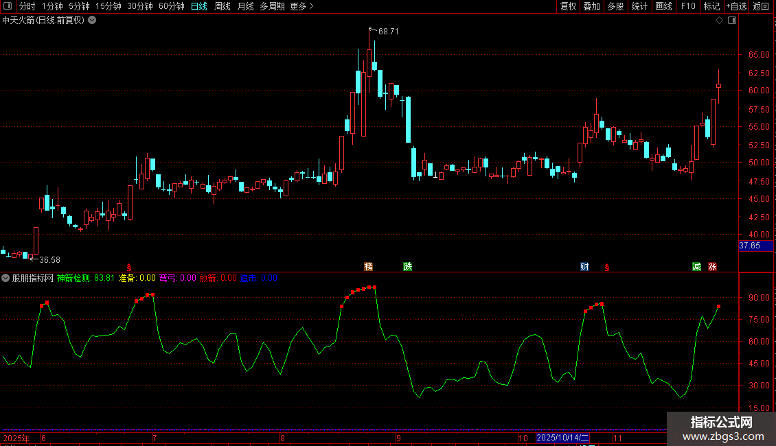 1. 神箭追击指标包含四个信号:追击信号用于右侧追涨,准备、弯弓和射箭信号用于低位抄底检测。