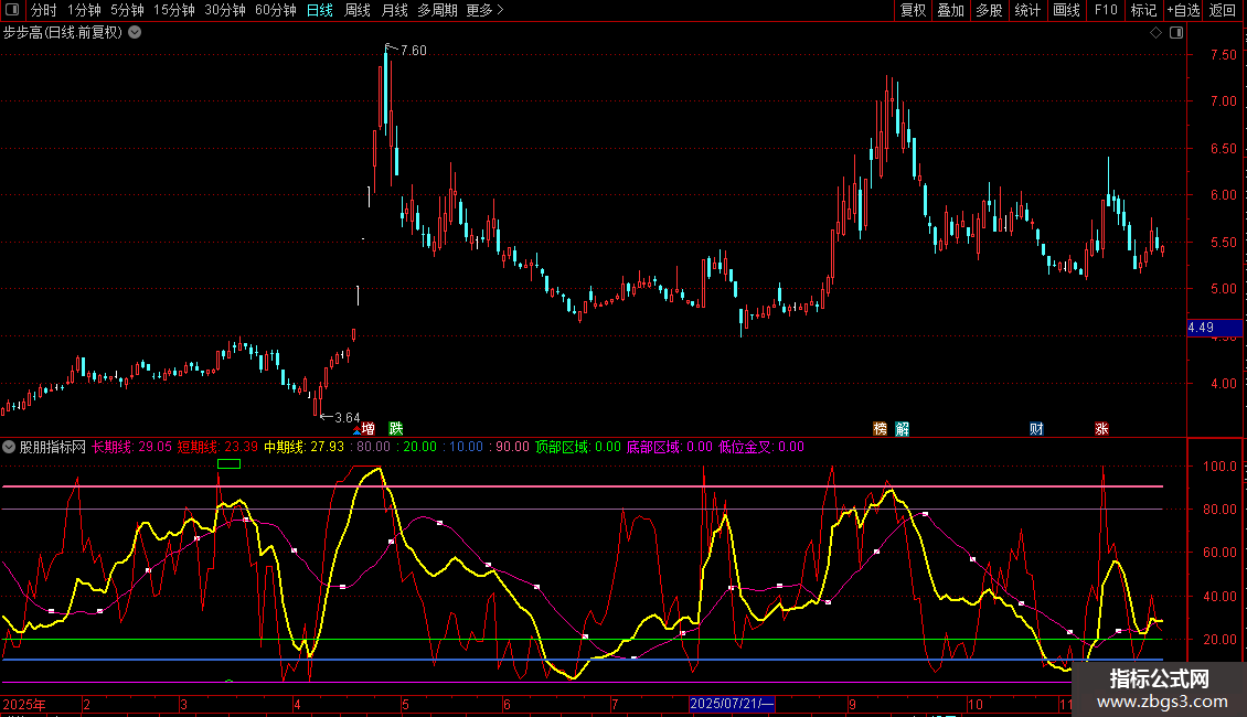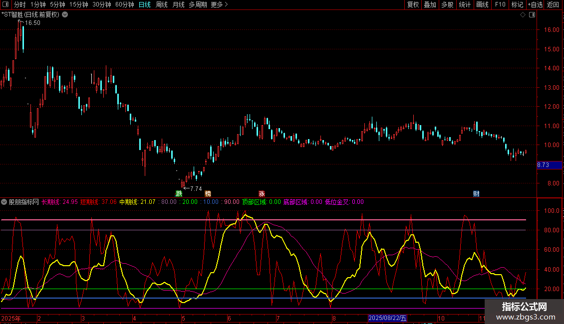 OR (长期线<8 AND 中期线<7 AND 短期线<15 AND 短期线>REF(短期线,1)) OR (长期线<10 AND 中期线<7 AND 短期线<1) ,COLORMAGENTA;