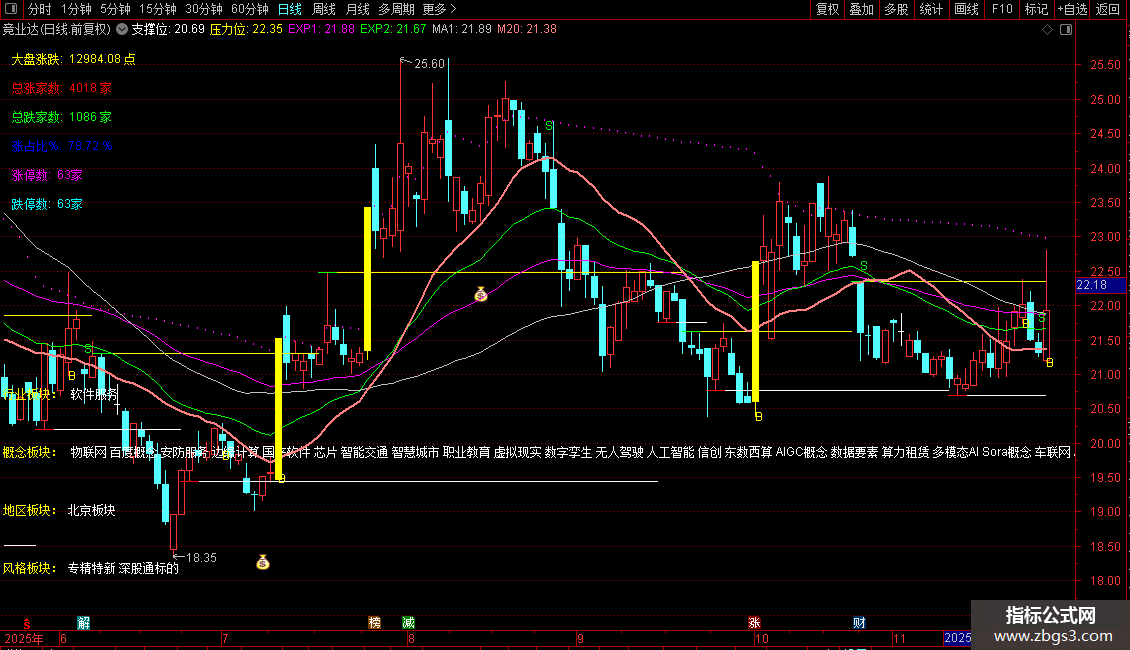 包含:大盘涨跌指数、行业概念、地区风格,支撑压力 钱袋 BS买卖,80%筹码