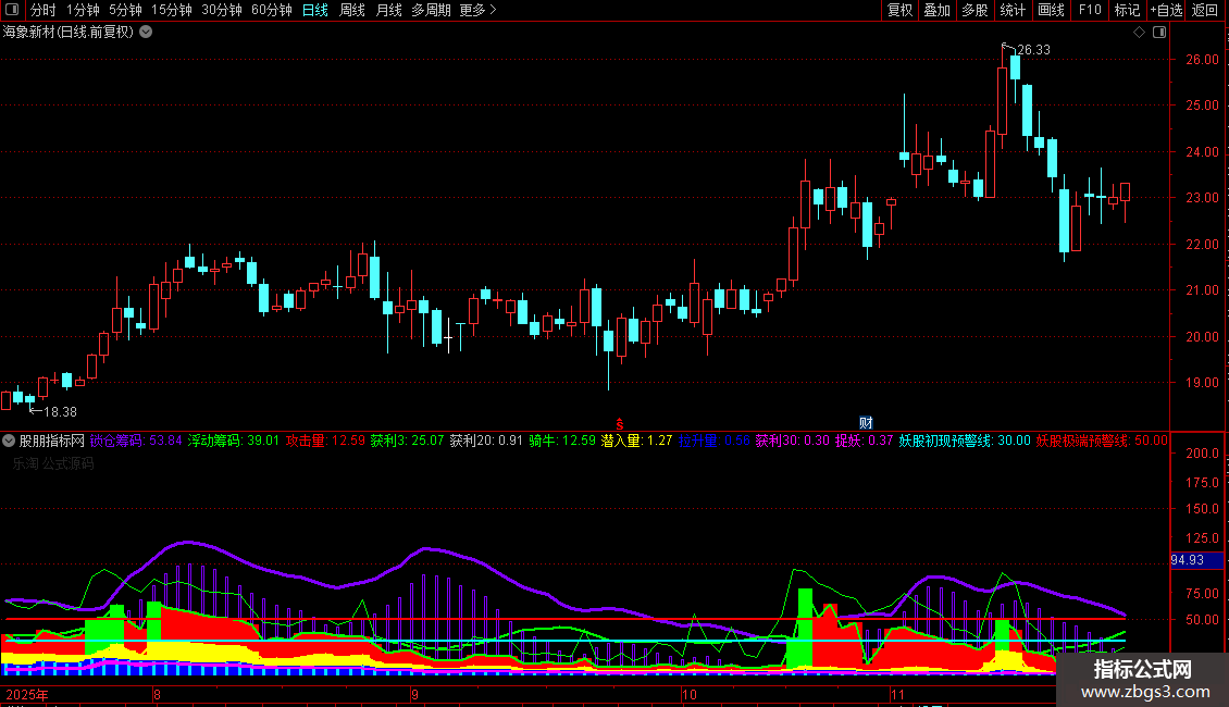当满足条件(锁仓筹码-浮动筹码)>0时,在攻击量和(锁仓筹码-浮动筹码)位置之间画柱状线,宽度为0.3,10不为0则画空心柱.,COLORFF0080,线宽为3