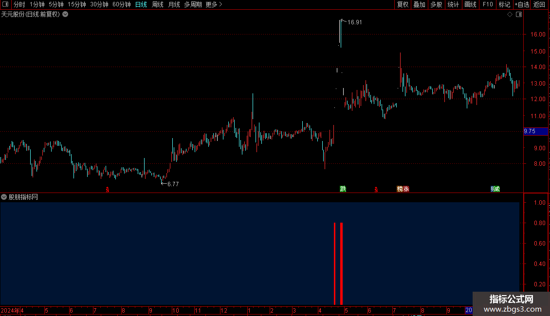 当满足条件收盘价上穿新高强度日前的最高价*1.05AND新高强度<上升周期时,在最低价位置画9号图标