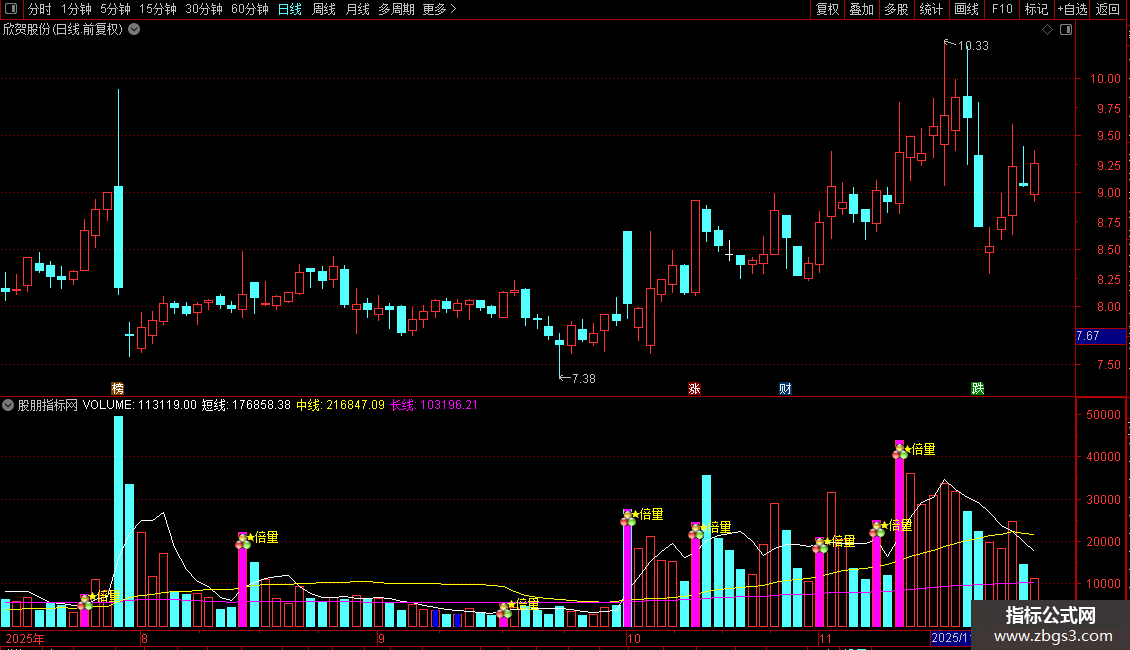1.倍量柱指成交量较前日放大一倍以上的粉色K线量柱