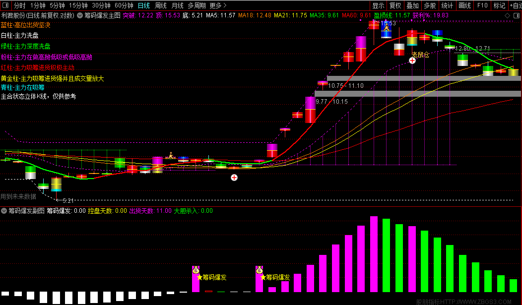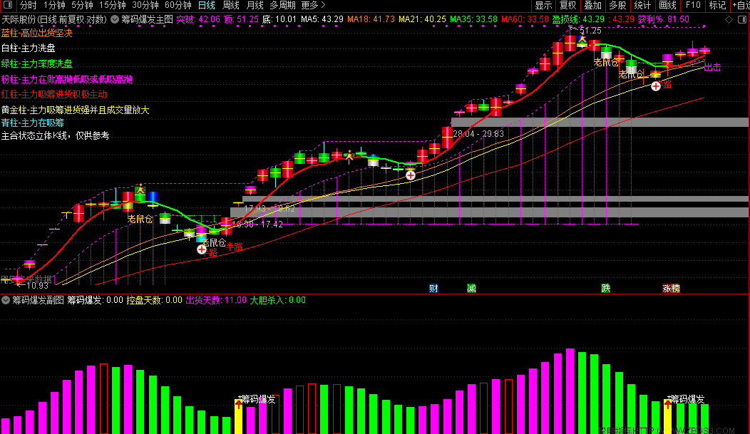 通达信『筹码爆发』主副/选股指标七彩筹码分析主力动向一眼识别主力意图源码