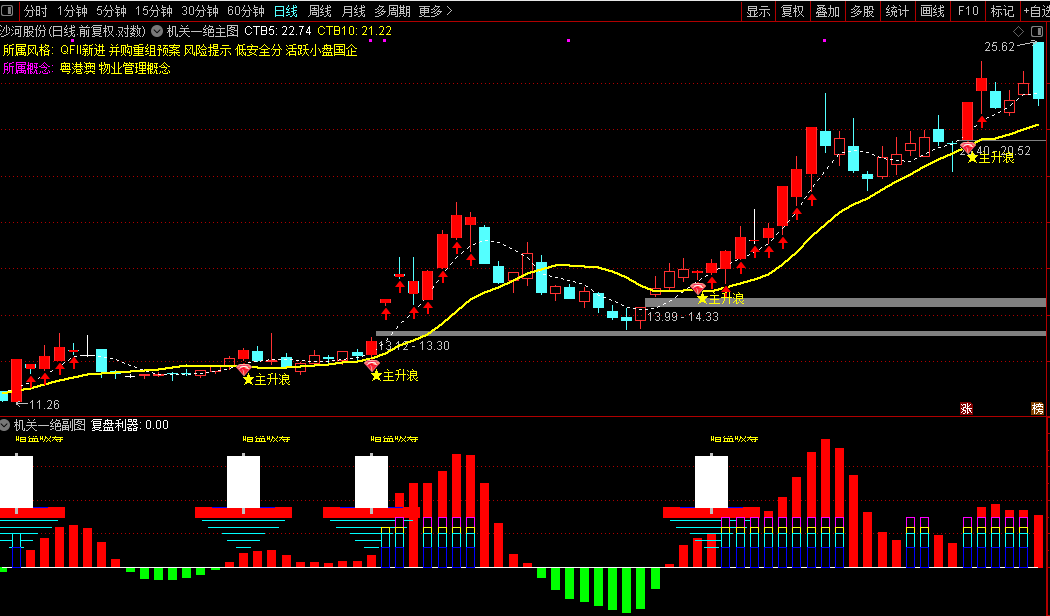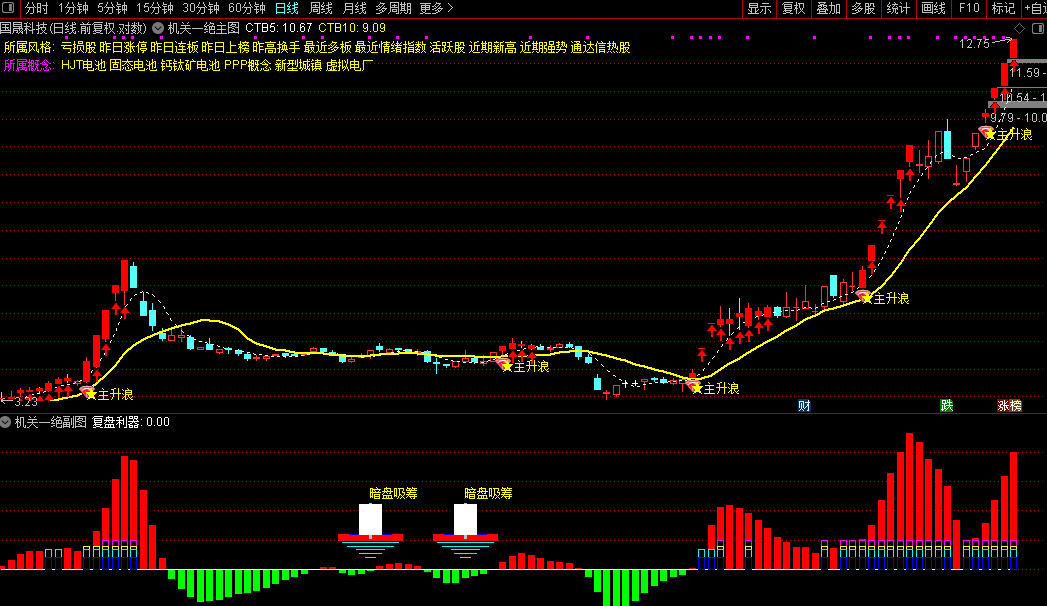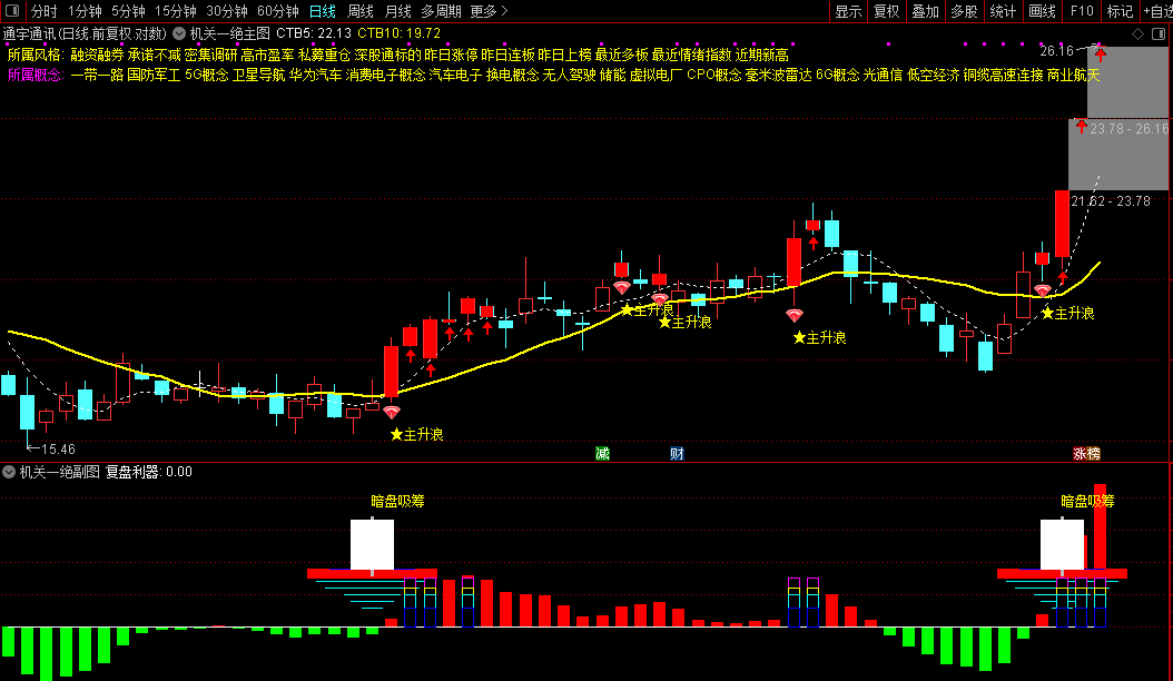 主图能直接显示股票所属板块,并通过红K线和“★主升浪”标记明确提示趋势启动点。副图用红绿柱状图直观展示机构资金进出情况,当出现“暗盘吸筹”信号时,说明机构正在悄悄建仓。