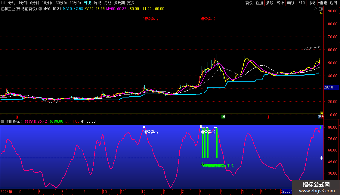 输出准备卖出:当满足条件趋势线>89时,在趋势线和89位置之间画柱状线,宽度为5,0不为0则画空心柱.,画白色