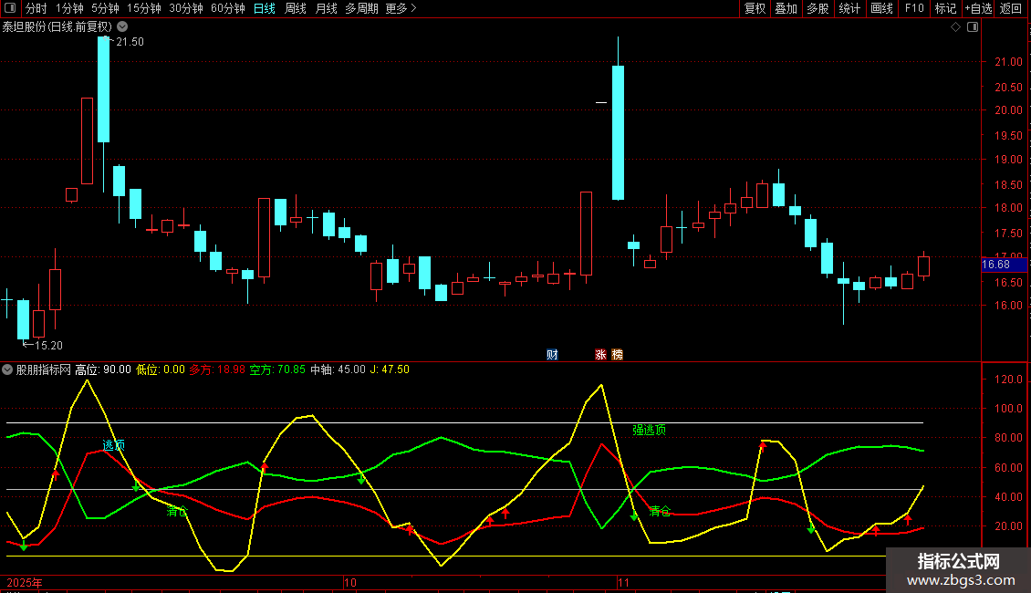 强逃顶条件:=(CROSS(90,多方) OR CROSS(空方,45)) AND (J线超买 OR J线死叉 OR MACD死叉);