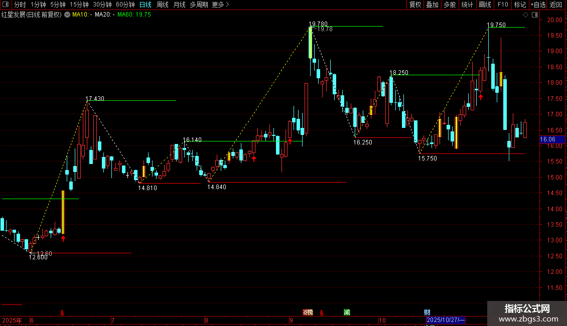 趋势向上:DRAWLINE(UU,L,NN,H,0),COLORYELLOW,DOTLINE;