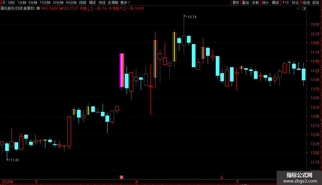 实体下三一价:MIN(OPEN,CLOSE)+ABS(OPEN-CLOSE)/3,NODRAW,COLORRED;