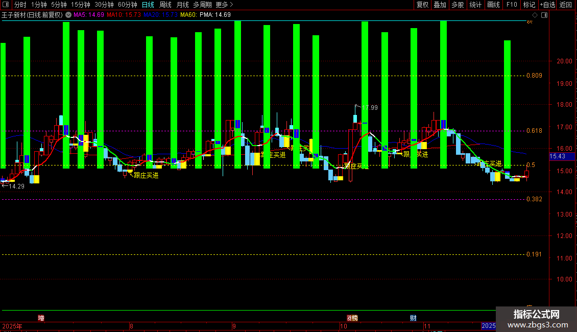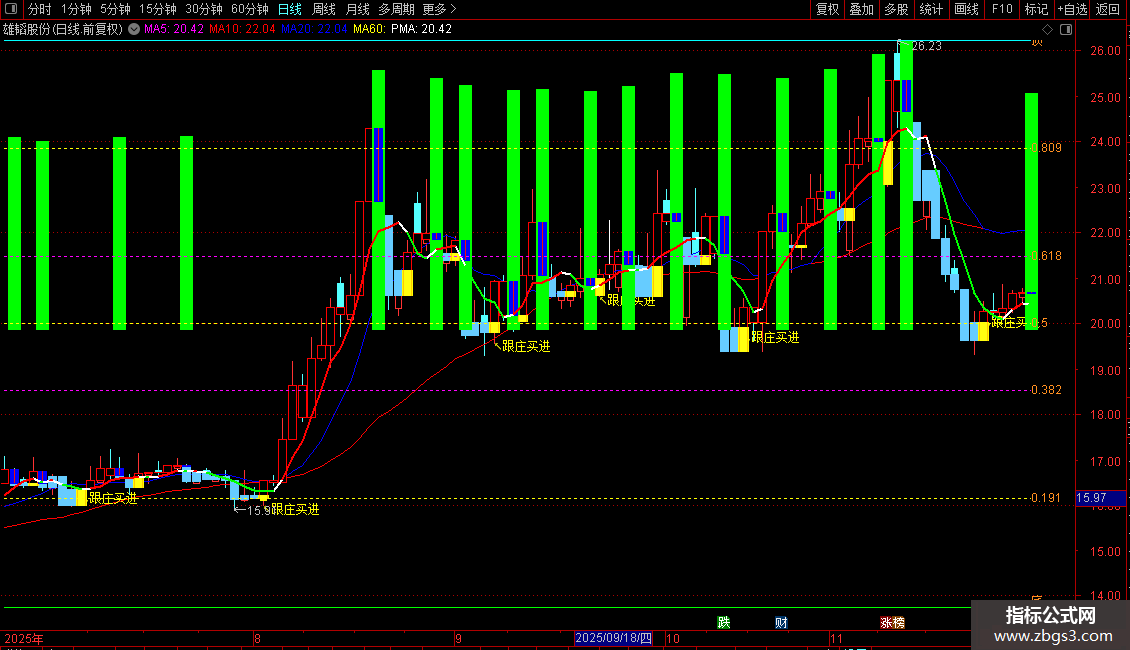 DRAWTEXT(FILTER(买=1,5),LOW-0.05,'↖跟庄买进'),COLORYELLOW;