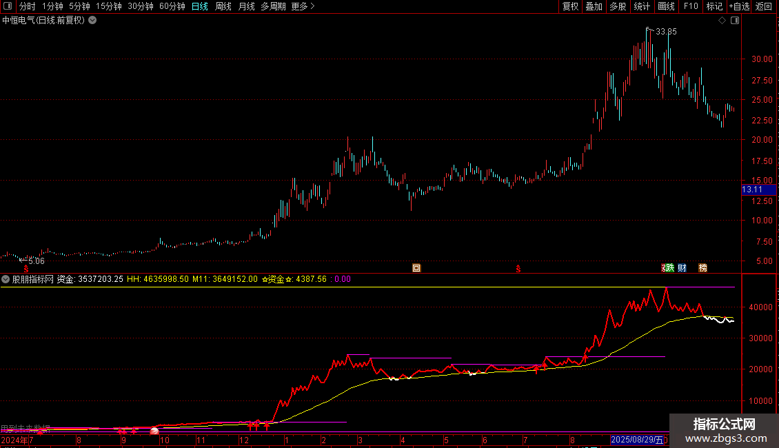 前期高点:=REF(资金,BARSLAST(DD1)),COLORFF00FF,NODRAW;