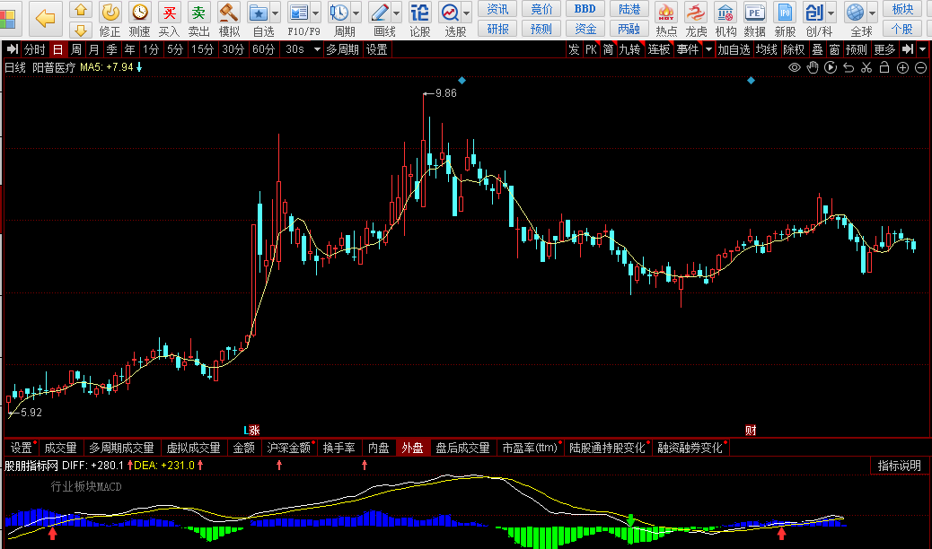 说明:'本指标调用该个股所在的(行业板块) 的MACD指标走势,以便个股与板块进行走势对比';