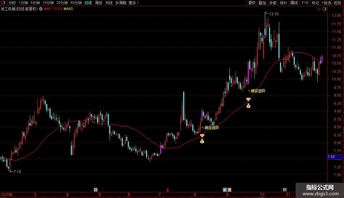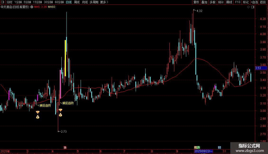 DRAWTEXT(VAR1 AND 捕捉线>REF(捕捉线,1) AND C>捕捉线,L*0.98,'↖捕捉趋势'),COLORYELLOW;