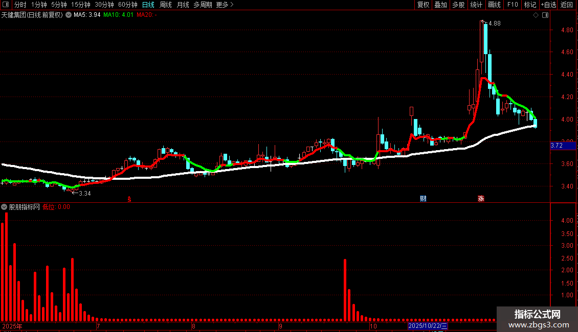 低位:IF(资金介入>0,资金介入*0.2,0),STICK,,LINETHICK5,COLORRED;