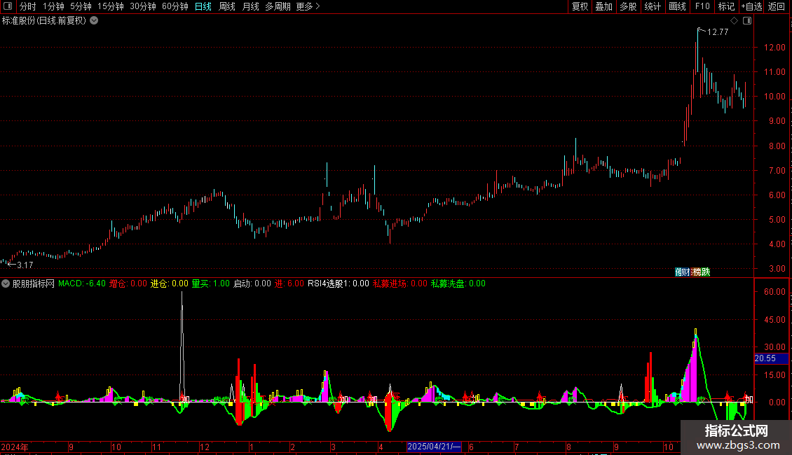 STICKLINE(MACDZS>REF(MACDZS,1),MACDZS,0,0.5,0),COLORFF00FF;