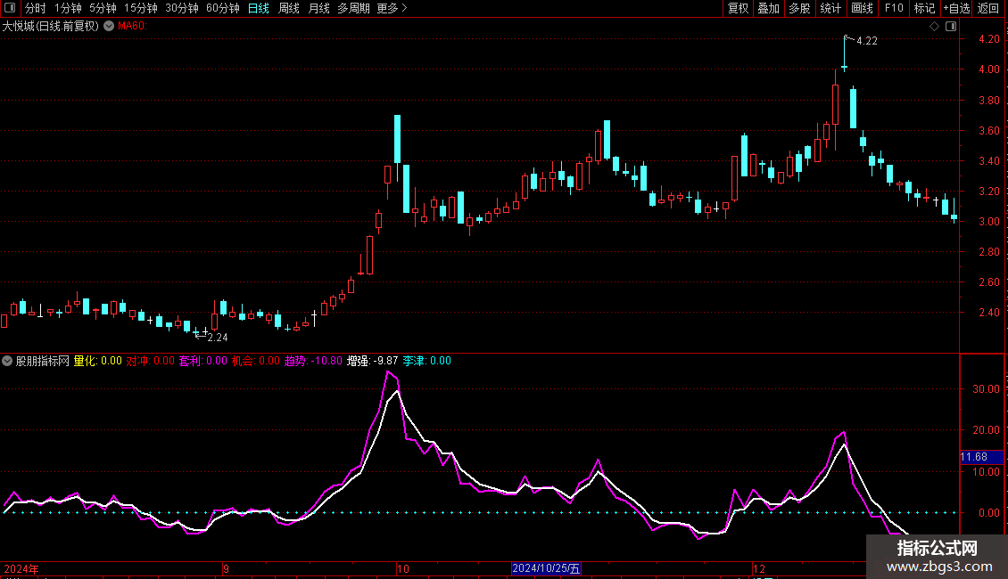 量化:IF(ZBGS14>3 AND ZBGS5=0,5,0),STICK,COLOR10FFFF,LINETHICK3;