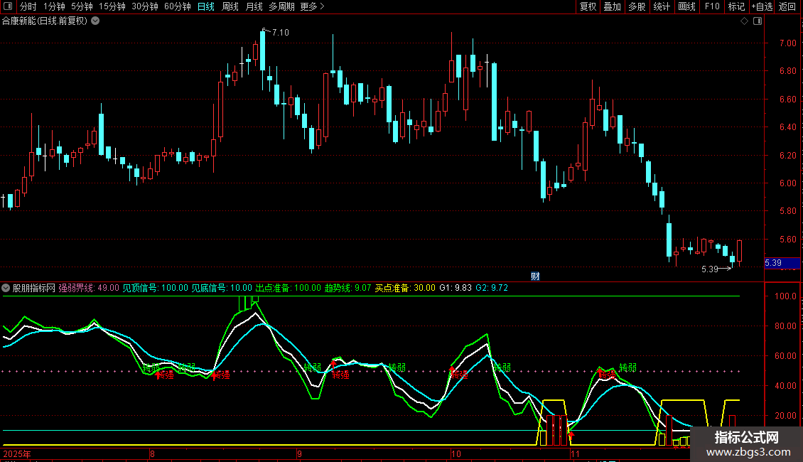 DRAWTEXT(CROSS(49,趋势线),52,'转弱'),COLORGREEN;