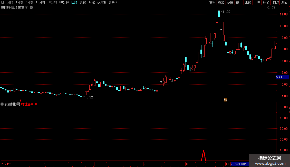绝世金牛:IF((A AND B AND D AND 避开刀尖 AND COUNT(A AND B AND D,20)=1),10,0),COLORRED,LINETHICK3;