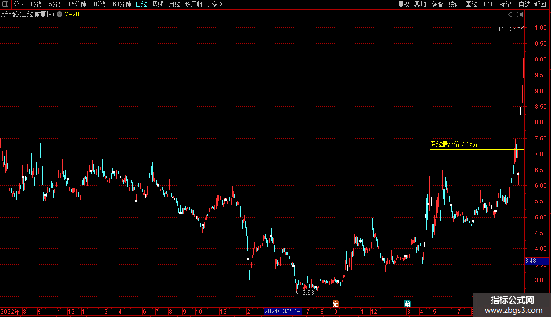 1、指标原理解析:股票涨停后,庄家常打压股价洗盘。大阴线会吓退不坚定投资者,庄家则低位吸筹。当股价突破该阴线最高价,即为分批建仓信号。