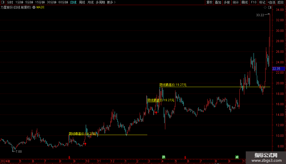 ZBGS329:=STRCAT('阴线最高价:',VAR2STR(REF(HIGH,ZBGS36),2));