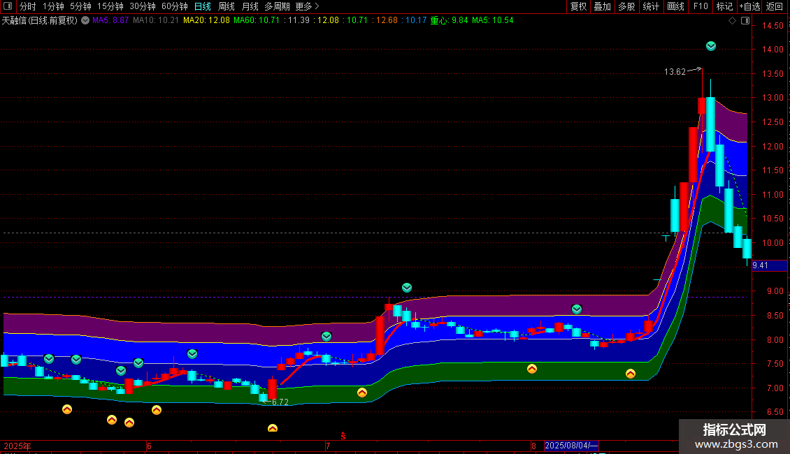 输出MA5:重心的5日加权移动平均,COLOR00FF00,DOTLINE