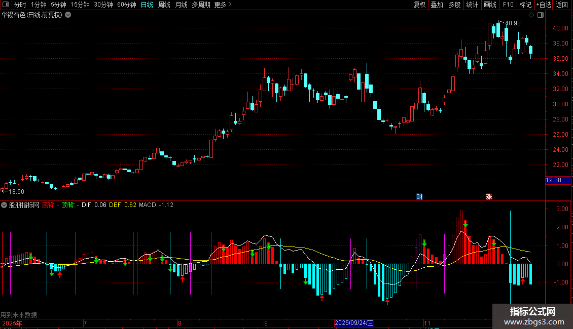 底背离:=REF(CLOSE,A1+1)>CLOSE AND DIFF>REF(DIFF,A1+1) AND CROSS(DIFF,DEA);