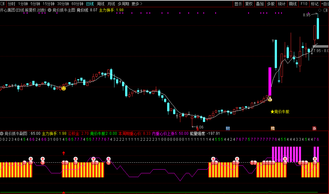 2. 优先选择同时出现红色/紫色柱、XJ≥5的个股;