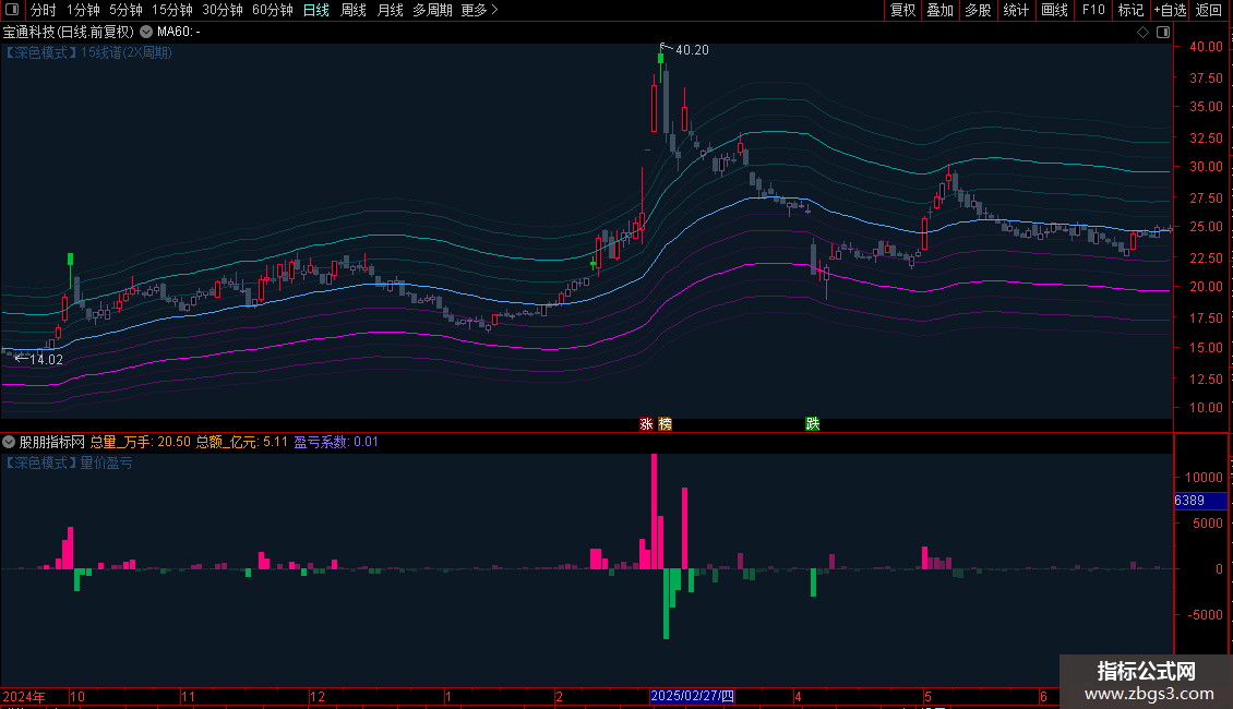 2. 江河横溢(资金盈亏副图):渐变色优化旧作2合1。当CM=1时使用传统的成交量柱状图;当CM=2时使用资金盈亏柱状图,原理是对价格重心涨跌幅作指数级降权,然后直接乘以成交量,就可以作为资金进出的一个参考指标了,可用于选股。