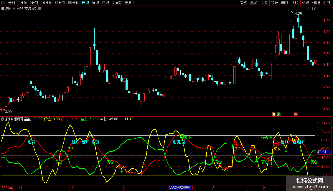 J线低位拐头向上:=J<50 AND J>REF(J,1) AND REF(J,1)<REF(J,2); {J线在低位开始向上转折}