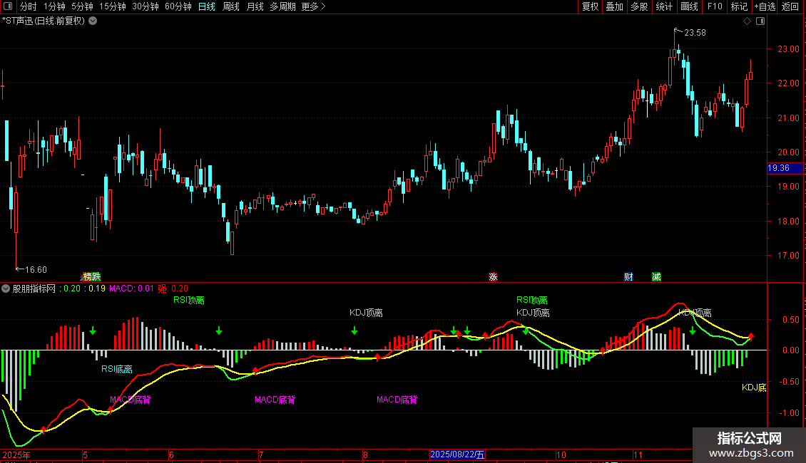 DRAWTEXT(B3>0,-0.3,'RSI底离'),COLORCYAN;{RSI底背离};