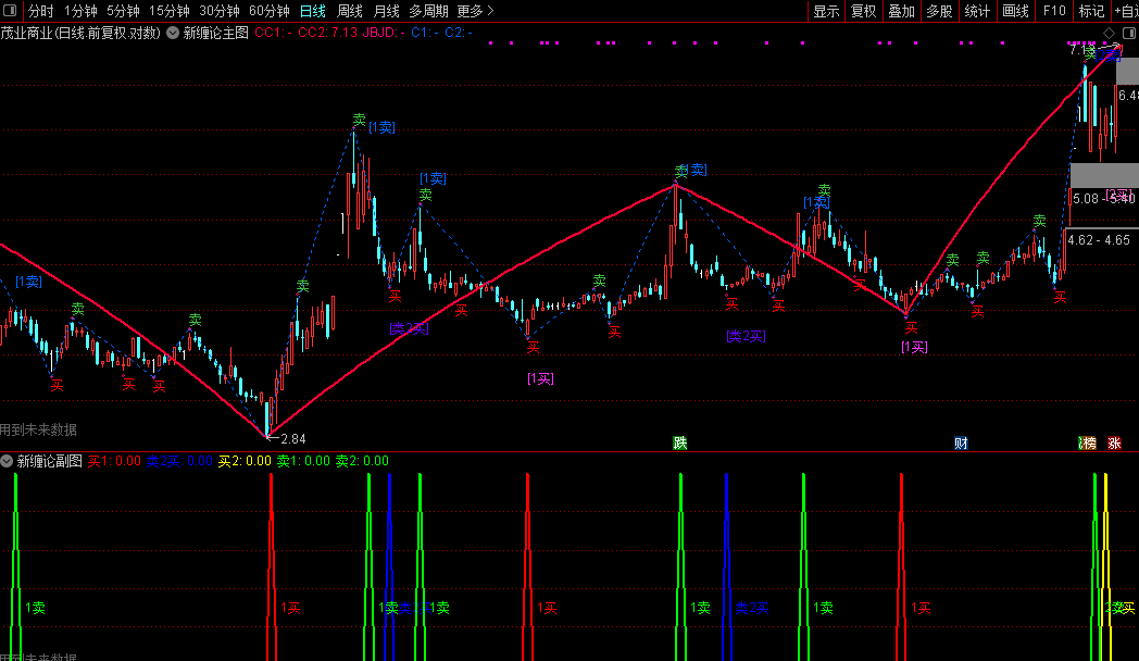 本工具为“新缠论波段指标”,包含1个主图指标、1个副图指标及3个选股指标,专注于识别股价波段结构中的关键买卖点。其核心在于通过自动划分趋势线段,结合背驰、中枢震荡等缠论逻辑,实时标注“买”“卖”信号,并具体指示“类二买”“二买”“一卖”等交易位置,辅助判断趋势转折。