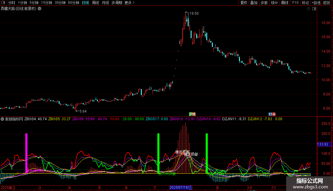 彩色柱子显示大资金动向,紫色代表多方大资金进场,绿色显示空方大资金流出。
