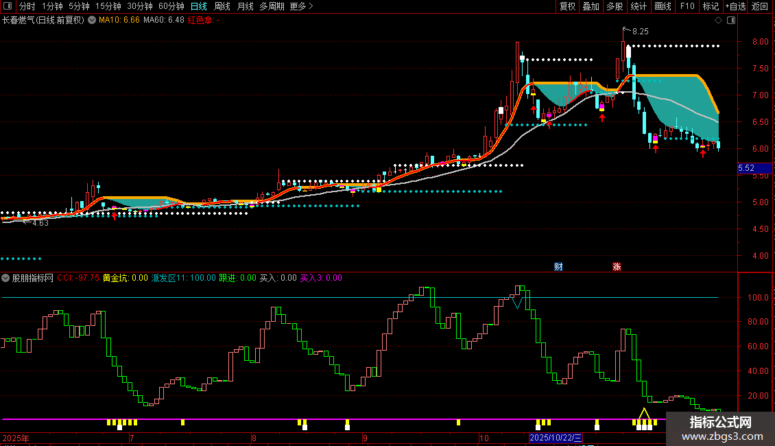 黄金坑:IF(短期5日乖离率<-100,10,0),COLORYELLOW,LINETHICK2;