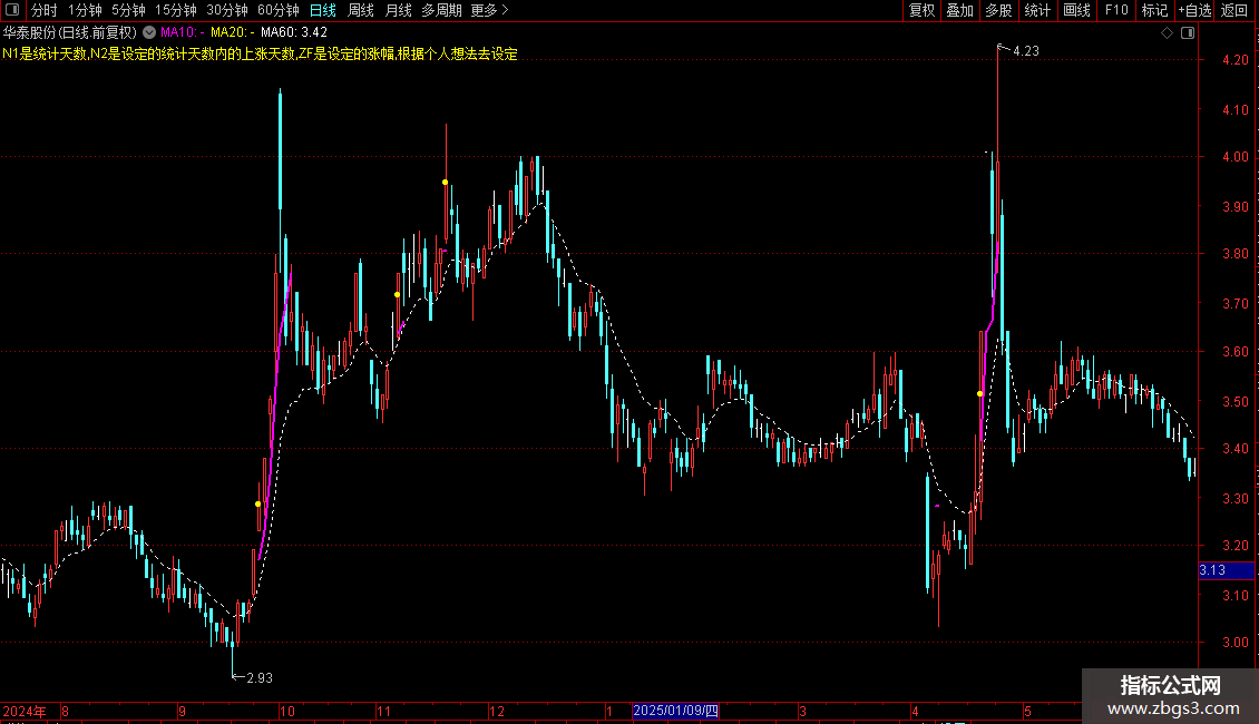 统计天数,连续上涨天数及上涨幅度根据个人的想法不同自己去设定。默认设定统计前4天中3天上涨,涨幅达到5%,也可以试试前5天中4天上涨,涨幅达到5%,或者前5天中3天上涨,涨幅达到6%......