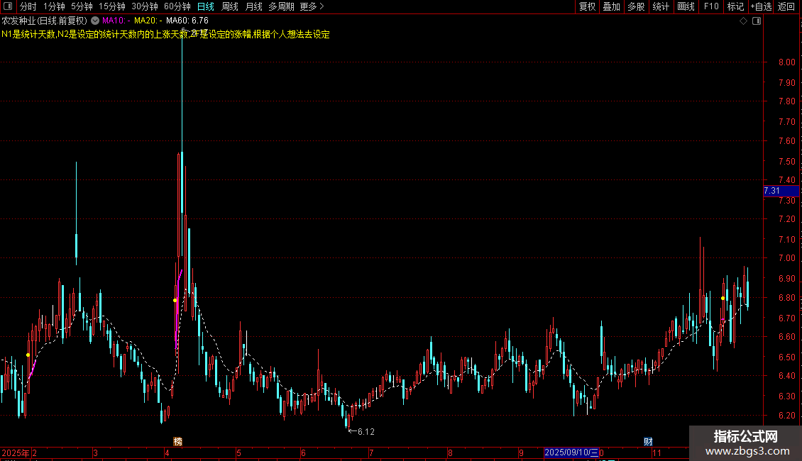 DRAWTEXT_FIX(1,0,0.0 ,0,'N1是统计天数,N2是设定的统计天数内的上涨天数,ZF是设定的涨幅,根据个人想法去设定'),COLORYELLOW;