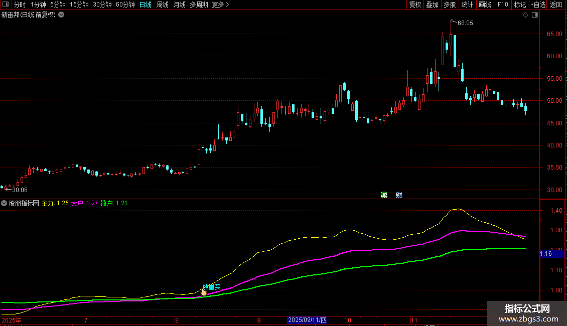 自用指标,不一样的三线定强弱副图,有买点提示,感觉挺精准的!黄线、紫线、绿线从上到下多头排列时关注,出现“放量买”时入手,往往有比较好的收益,甚至可能有惊喜。本指标源码,无未来函数!