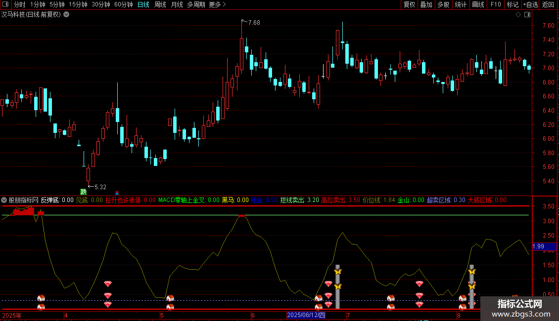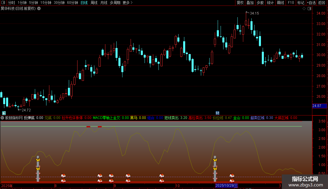 当满足条件拉升也许涨停时,在0.6位置画25号图标