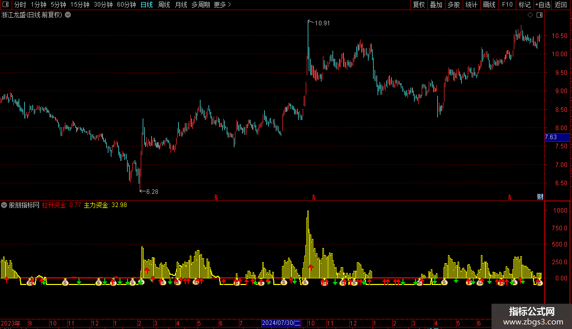 DRAWICON(CROSS(MAZL,ZLGJ) AND MA(C,5)<REF(MA(C,5),1) ,MA(拉升资金,5),2);