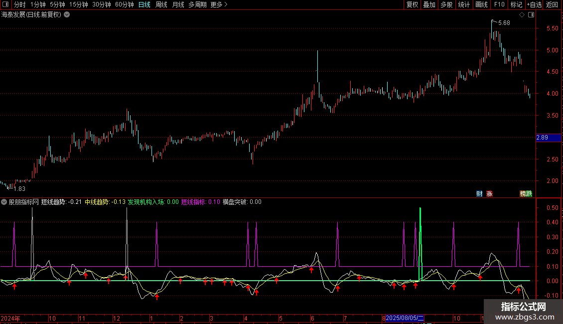 • 买入信号:当“发现机构入场”信号出现(绿色粗线),且短线趋势上穿中线趋势并伴随放量,是较好的介入点。