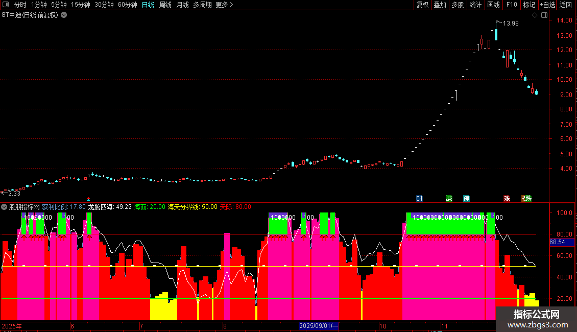STICKLINE(获利比例<=1,0,获利比例,6,1),COLORWHITE;