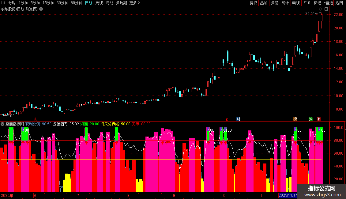 指标主要通过“获利比例”和“龙腾四海”两个维度,反映当前市场中持仓者的盈利状况及股价在近期价格区间的相对位置。获利比例显示有多少投资者处于盈利状态,用不同颜色区分低、中、高获利区域,并在极端值(如几乎无人盈利或绝大多数人盈利)时给出图标提示;“龙腾四海”则衡量股价在近一段周期内的强势程度,越接近高位说明走势越强。